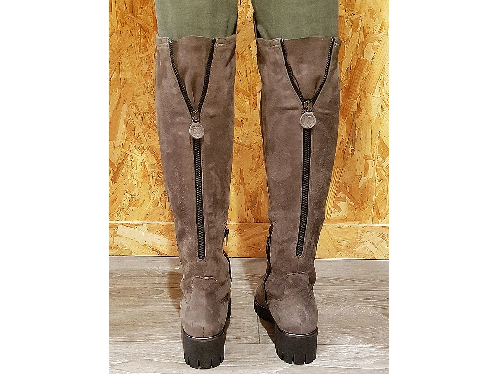 Cette jolie paire de bottes montent sur les genoux et sont évasées sur le haut, mais pas trop. La longue tige en cuir velours beige taupe donnera à vos jambes une longueur infinie. Les jambes fines et galbées seront les plus aptes à se faufiler sans peines dans ces longues chaussures, grâce aux deux zip ; un sur le côté intérieur et l’autre sur l’arrière de la botte. Vous pouvez prendre votre pointure habituelle, les chaussures Donna Carolina chaussent normalement.
