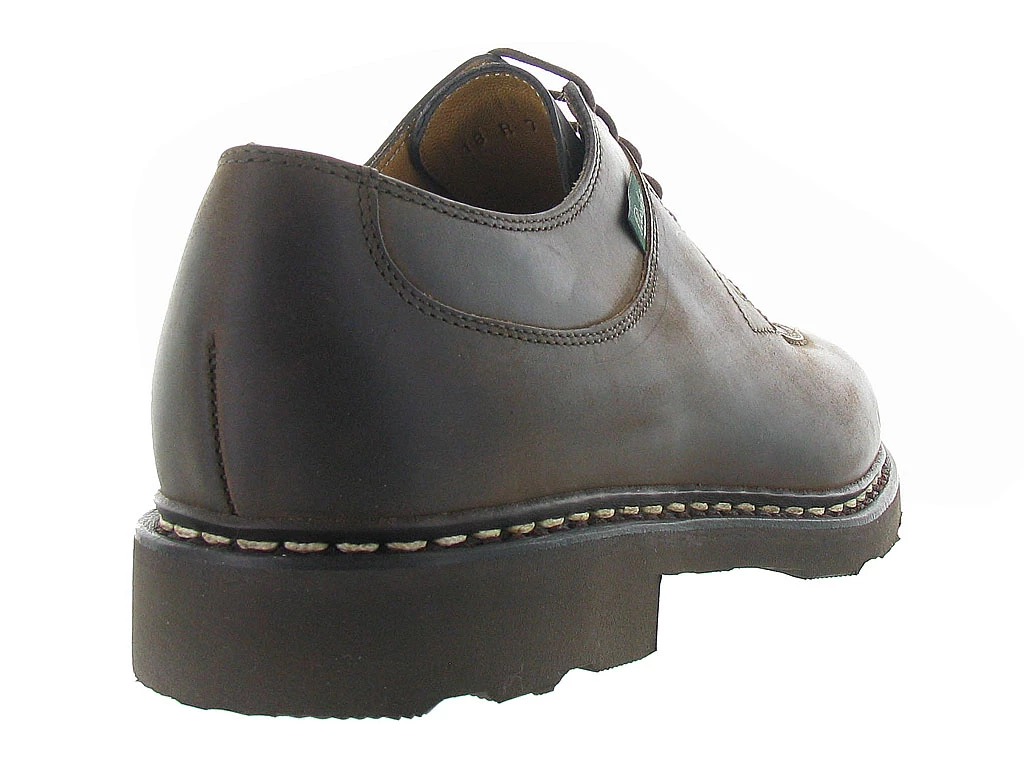 La caractéristique de cette chaussure est sans nul doute sa qualité de fabrication, les matières utilisées et le savoir faire du made in France. Paraboot est fabriqué en Isère dans un petit complexe industriel. La fabrication à la main donne une touche qualitative à cette chaussure qui reste un classique de chez Paraboot. Le modèle Avignon se décline en différentes variantes dont le cuir lisse marron et noir. La semelle est en gomme et c’est une construction « cousue norvegien ».